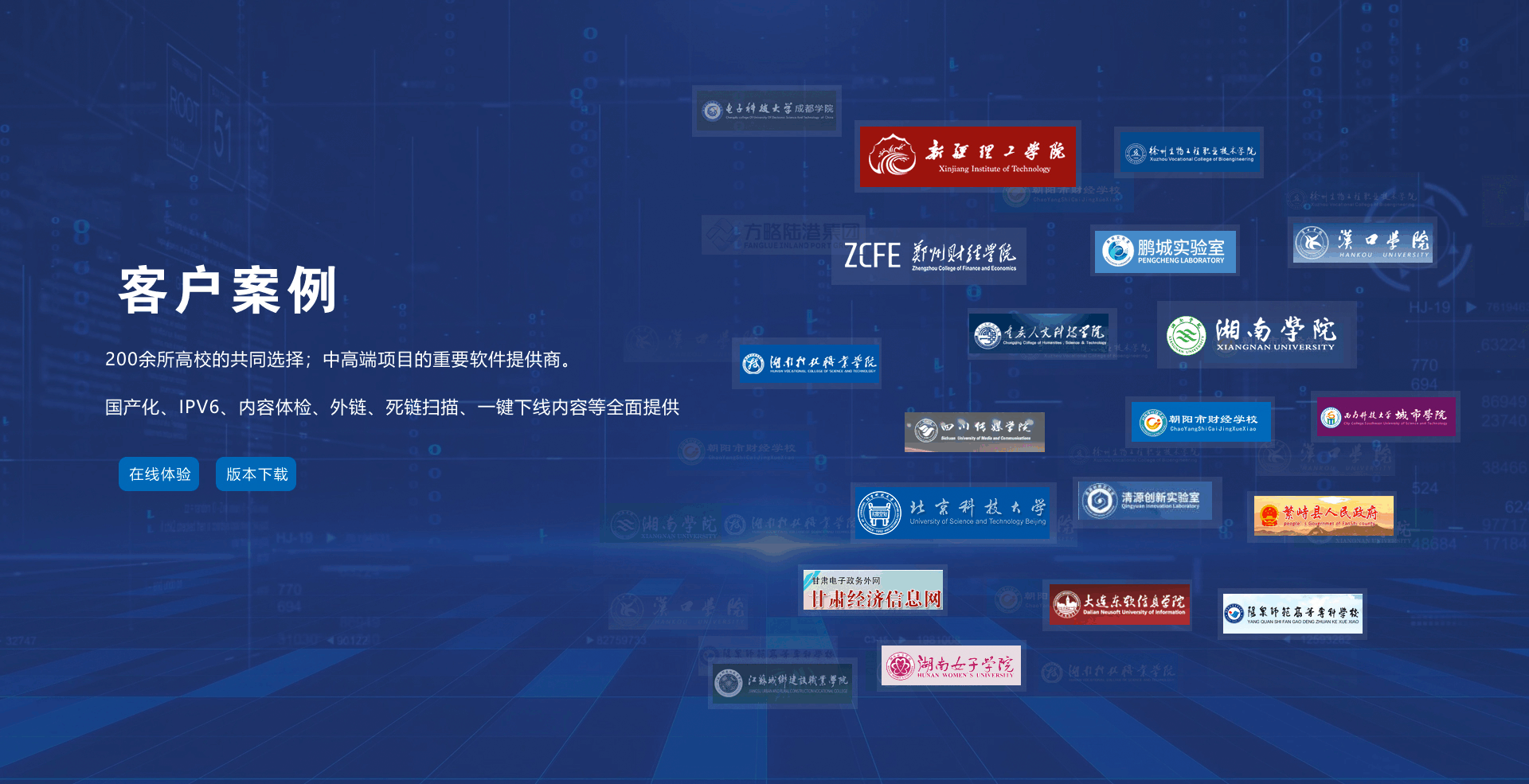 | 國家安全等保認證 | 數百個大型客戶每個季度掃描 | 動靜態(tài)分離部署 |